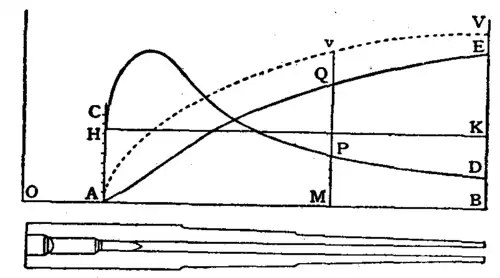 An indicator diagram can be drawn for a gun (fig. 3) as for a steam-engine, representing graphically by a curve CPD the relation between the volume and pressure of the powder-gas; and in addition the curves AQE of energy e, Av V of velocity v, and At T of time t can be plotted or derived, the velocity and energy at the muzzle B being denoted by V and E.