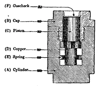 To measure the pressure experimentally in the bore of a gun, the crusher-gauge is used as shown in fig. 6, nearly full size; it records the maximum pressure by the compression of a copper cylinder in its interior; it may be placed in the powder-chamber, or fastened in the base of the shot.