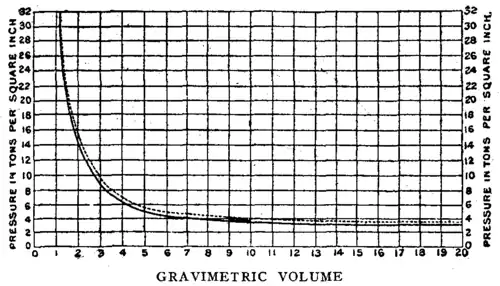 A charge of powder, or other explosive, of varying weight P lb, is fired in an explosion-chamber (fig. 7, scale about 1/5) of which the volume C, cub. in., is known accurately, and the pressure p, tons per sq. in., was recorded by a crusher-gauge (fig. 6). The result is plotted in figs. 8 and 9, in a curve showing the relation between p and D the gravimetric density, which is the specific gravity of the P ℔ of powder when filling the volume C, cub. in, in a state of gas; or between p and v, the reciprocal of D, which may be called the gravimetric volume (G. V.), being the ratio of the volume of the gas to the volume of an equal weight of water.