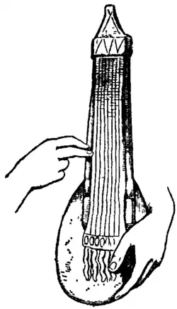 The barbat was a variety of rebab (q.v.), a bass instrument, differing only in size and number of strings. This is quite in accordance with what we know of the nomenclature of musical instruments among Persians and Arabs, with whom a slight deviation in the construction of an instrument called for a new name.[11] The word barbud applied to the barbiton is said to be derived[12] from a famous musician living at the time of Chosroes II. (A.D. 590-628), who excelled in playing upon the instrument. From a later translation of part of the same authority into German[13] we obtain the following reference to Persian musical instruments: “Die Sänger stehen bei seinem Gastmahl; in ihrer Hand Barbiton(i.) und Leyer(ii.) und Laute(iii.) und Flöte(iv.) und Deff (Handpauke).” Mr Ellis, of the Oriental Department of the British Museum, has kindly supplied the original Persian names translated above, i.e. (i.) barbut, (ii.) chang, (iii.) rubāb, (iv.) nei. The barbut and rubab thus were different instruments as late as the 19th century in Persia. There were but slight differences if any between the archetypes of the pear-shaped rebab and of the lute before the application of the bow to the former—both had vaulted backs, body and neck in one, and gut strings plucked by the fingers. (K. S.)