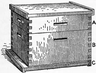 | Fig. 15.—Langstroth Hive. (Redrawn from the A B C of Bee-Culture, published by the A. I. Root Co., Medina, Ohio, U.S.A.) |
