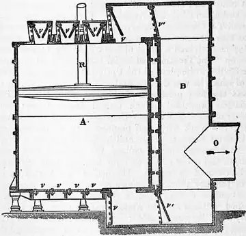 The general action of a blowing engine may be illustrated by the sectional view shown on fig. 3, which represents the internal view of one of the blowing cylinders of the engines erected at the Dowlais Ironworks as far back as 1851. Many of the details are now obsolete, but the general scheme is the same as in all blowing engines. Here A is the air cylinder; in this is a piston whose rod is marked R; this piston is usually made air-tight by some form of packing fitted into the groove which runs round its edge. In this particular case the cylinder is placed vertically and its piston rod is actuated from the end of a rocking beam. The top and bottom ends are closed by covers and in these are a number of openings controlled by valves opening inwards so that air can flow freely in but cannot return. The piston is shown moving downwards. Air is now being drawn into the space above the piston through the valves v at the top, and the air in the space A below the piston, drawn in during the previous up-stroke, is being expelled through the valve v′ into the discharge chamber B, thence passing to the outlet pipe O. The action is reversed on the up-stroke. Thus it will be seen that air is being delivered both during the up-stroke and the down-stroke, and therefore flows almost continuously to the furnaces. There must, however, be momentary pauses at the ends of the strokes when the direction of movement is changed, and as the piston, though worked from an evenly rotating crank shaft, moves more quickly at the middle and slows down to no speed at the ends of its travel, there must be a considerable variation in the speed of delivery of the air. The air is therefore led from O into a large storage chamber or reservoir, whence it is again taken to the furnace; if this reservoir is made sufficiently large the elasticity of the air in it will serve to compensate for the irregularities, and a nearly uniform stream of air will flow from it. The valves used in this case and in most of the older blowing engines consist of rectangular metal plates hinged at one of the longer edges; these plates are faced with leather or india rubber so as to allow them to come to rest quietly and without clatter and at the same time to make them air-tight. It will be seen that some of these valves hang vertically and others lie flat on the bottom of the cover. The Dowlais cylinder is very large, having a diameter of 12 ft. and a piston stroke of 12 ft., giving a discharge of 44,000 cub. ft. of air per minute, at a pressure of 41/4 ℔ to the square inch.