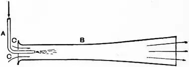 In the jet blower (fig. 9) a jet of steam is used to induce a current of air. Into one end of a trumpet-shaped pipe B projects a steam pipe A. This steam pipe terminates in a small opening, say, one-eighth of an inch, through which the steam is allowed to flow freely. The effect is to cause a movement of the air in the pipe, with the result that a fresh supply is drawn in through the annular opening at C, C, and a continuous stream of air passes along the pipe. This is the form of blower made by Messrs Meldrum Bros. of Manchester, and is largely used for delivering air under the fire bars of boiler and other furnaces. In some cases the jets of steam are allowed to enter a boiler furnace above the fire, thus inducing a current of air which helps the chimney draught and is often used to do away with the production of smoke; they are also used for producing currents of air for purposes other than those of boiler fires, and are very convenient where considerable quantities of air are wanted at very low pressures and where the presence of the moisture of the steam does not matter.