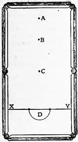 | A. The billiard spot measured from the nearest point of the face of the cushion. B. Pyramid spot. C. Centre spot. XY. Baulk line. D. Semicircle of 111/2 in. radius, known as the D. |