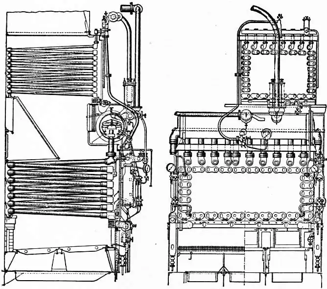 Messrs John I. Thornycroft & Co. make two forms of express boiler. One called the Thornycroft boiler consists of three chambers connected by tubes which are straight for the major portion of their length but bent at each end to enable them to enter the steam- and water-chambers normally. Thornycroft.The outer rows of tubes form “water-walls” at their lower parts, but permit the passage of the gases between them at their upper ends. Similarly the inner rows form “water-walls” at their upper parts, but are open at the lower ends. The products of combustion are thus compelled to pass over the whole of the heating surfaces. The fire-rows of tubes in this boiler are made 13/8 in. outside diameter and the remainder are made 11/8 in. diameter. Large outside circulating pipes are provided at the front end of the boiler.