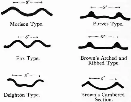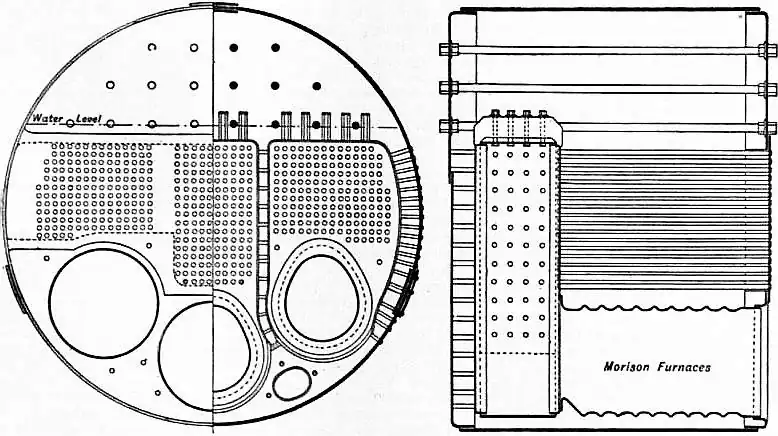 The cylindrical multitubular return tube boiler is in almost universal use in merchant steamers. It is made in various sizes ranging up to 17 ft. in diameter, the usual working pressure being from 160 to 200 ℔ per sq. in., although in some few cases pressures of 265 ℔ per sq. in. are in use. These boilers Marine. are of two types, double- and single-ended. In single-ended boilers, which are those most generally used, the furnaces are fitted at one end only and vary in number from one in the smallest boiler to four in the largest. Three furnaces are the most usual practice. Each furnace generally has its own separate combustion chamber. In four furnace boilers, however, one chamber is sometimes made common to the two middle furnaces, and sometimes one chamber is fitted to each pair of side furnaces. In double-ended boilers furnaces are fitted at each end. In some cases each furnace has a separate combustion chamber, but more usually one chamber is made to serve for two furnaces, one at each end of the boiler. The two types of boilers are shown in figs. 7 and 8, which illustrate boilers made by Messrs D. Rowan & Co. of Glasgow, and which may be taken as representing good modern practice. The furnaces used in the smaller sizes are often of the plain cylindrical type, the thickness of plate varying from 3/8 in. up to 3/4 in. according to the diameter of the furnace and the working pressure. Occasionally furnaces with “Adamson” joints similar to those used in Lancashire boilers are employed, but for large furnaces and for high pressures corrugated or ribbed furnaces are usually adopted. Sketches of the sections of these are shown in fig. 9. The sections of the Morison, Fox and Deighton types are made from plates originally rolled of a uniform thickness, made into a cylindrical form with a welded longitudinal joint and then corrugated, the only difference between them being in the shapes of the corrugations. In the other three types the plates from which the furnaces are made are rolled with ribs or thickened portions at distances of 9 in. These furnaces are stronger to resist collapse than plain furnaces of the same thickness, and accommodate themselves more readily to changes of temperature.
