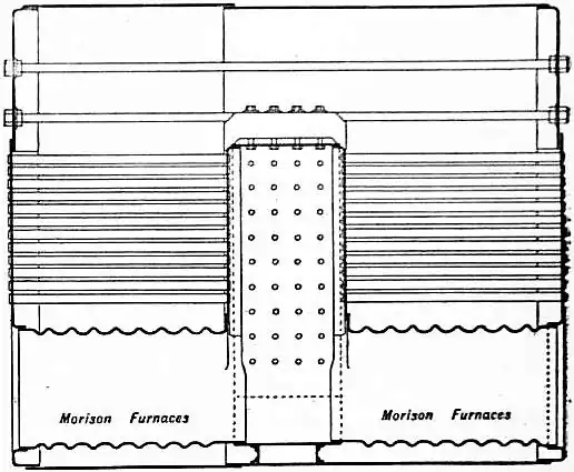 In all three types of boiler the brickwork is constructed to form one central flue passing along the bottom of the boiler and two side flues extending up the side nearly to the water-level. A cross section of the brickwork is shown in fig. 2. The usual arrangement is for the flue gases to be divided as they leave the internal flue; one-half returns along each side flue to the front of the boiler, and the whole then passes downwards into the central flue, travelling under the bottom of the boiler until the gases again reach the back end, where they pass into the chimney. In a few cases the arrangement is reversed, the gases first passing along the bottom flue and returning along the side flues. This latter arrangement, whilst promoting a more rapid circulation of water, has the disadvantage of requiring two dampers, and it is not suitable for those cases in which heavy deposits form on the bottoms of the boilers.