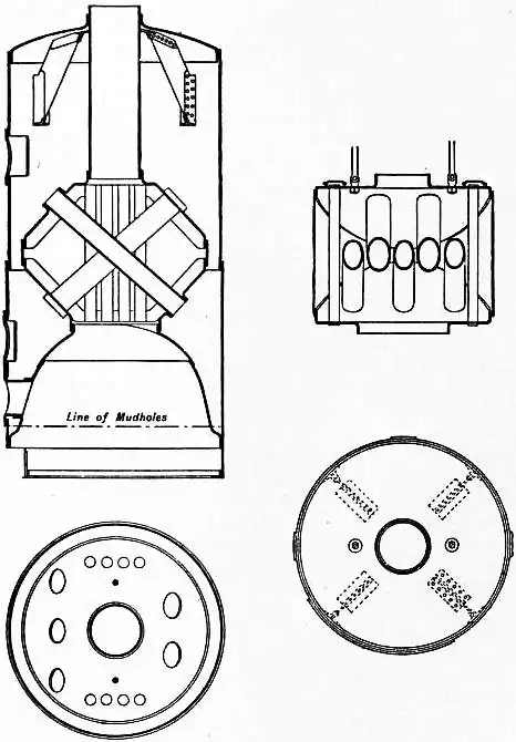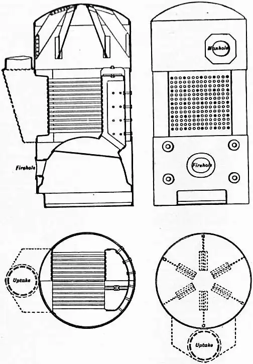 Where floor space is limited and also for small installations, other forms of cylindrical boilers are used, most of them being of the vertical type. That most commonly used is the simple vertical boiler, with a plain vertical fire-box, and an internal smoke stack traversing the steam space. The fire-box is made slightly Vertical. tapering in diameter, the space between it and the shell being filled with water. In all but the small sizes cross tubes are generally fitted. These are made about 9 in. in diameter of 3/8-in. plate flanged at each end to enable them to be riveted to the fire-box plates. They are usually fitted with a slight inclination to facilitate water circulation. and a hand-hole closed by a suitable door is provided in the outer shell opposite to each tube for cleaning purposes. A boiler of this kind is illustrated in fig. 4. This form is often used on board ship for auxiliary purposes. Where more heating surface is required than can be obtained in the cross-tube boiler other types of vertical boiler are employed.