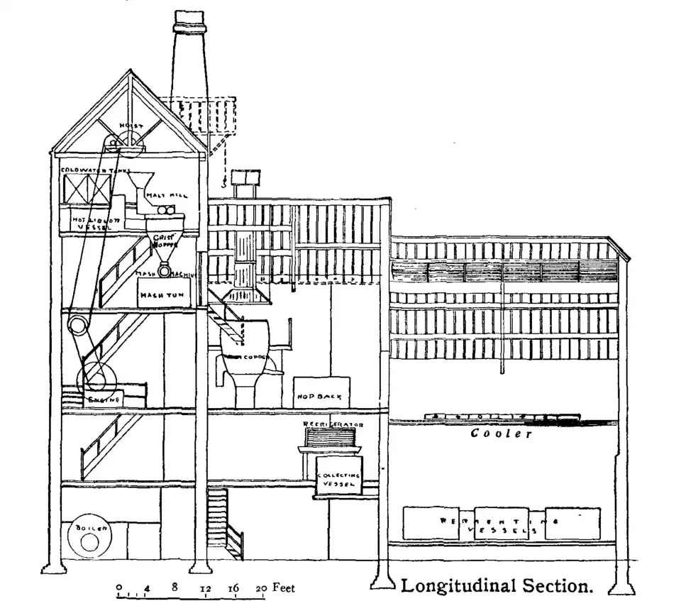 The malt, which is hoisted to the top floor, after cleaning and grading is conveyed to the Malt Mill, where it is crushed. Thence the ground malt, or “grist” as it is now called, passes to the Grist Hopper, and from the latter to the Mashing Machine, in which it is intimately mixed with hot water from the Hot Liquor Vessel. From the mashing machine the mixed grist and “liquor” pass to the Mash-Tun, where the starch of the malt is rendered soluble. From the mash-tun the clear wort passes to the Copper, where it is boiled with hops. From the copper the boiled wort passes to the Hop Back, where the insoluble hop constituents are separated from the wort. From the hop back the wort passes to the Cooler, from the latter to the Refrigerator, thence (for the purpose of enabling the revenue officers to assess the duty) to the Collecting Vessel,[1] and finally to the Fermenting Vessels, in which the wort is transformed into “green” beer. The latter is then cleansed, and finally racked and stored.
