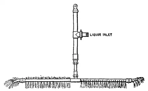 Mashing is a process which consists mainly in extracting, by means of water at an adequate temperature, the soluble matters pre-existent in the malt, and in converting the insoluble starch and a great part of the insoluble nitrogenous compounds into soluble and partly fermentable products. Mashing is, without a doubt, the most important of the brewing processes, for it is largely in the mash-tun that the character of the beer to be brewed is determined. In modern practice the malt and the mashing “liquor” (i.e. water) are introduced into the mash-tun simultaneously, by means of the mashing machine (fig. 2, A). This is generally a cylindrical metal vessel, commanding the mash-tun and provided with a central shaft and screw. The grist (as the crushed malt is called) enters the mashing machine from the grist case above, and the liquor is introduced at the back. The screw is rotated rapidly, and so a thorough mixture of the grist and liquor takes place as they travel along the mashing machine. The mash-tun (fig. 2) is a large metal or wooden vessel, fitted with a false bottom composed of plates perforated with numerous small holes or slits (C). This arrangement is necessary in order to obtain a proper separation of the “wort” (as the liquid portion of the finished mash is called) from the spent grains. The mash-tun is also provided with a stirring apparatus (the rakes) so that the grist and liquor may be intimately mixed (D), and an automatic sprinkler, the sparger (fig. 2, B, and fig. 3), which is employed in order to wash out the wort remaining in the grains. The sparger consists of a number of hollow arms radiating from a common centre and pierced by a number of small perforations. The common central vessel from which the sparge-arms radiate is mounted in such a manner that it rotates automatically when a stream of water is admitted, so that a constant fine spray covers the whole tun when the sparger is in operation. There are also pipes for admitting “liquor” to the bottom of the tun, and for carrying the wort from the latter to the “underback” or “copper.”