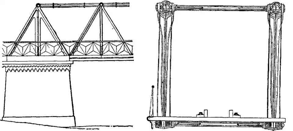 13. Transporter Bridges.—This new type of bridge consists of a high level bridge from which is suspended a car at a low level. The car receives the traffic and conveys it across the river, being caused to travel by electric machinery on the high level bridge. Bridges of this type have been erected at Portugalete, Bizerta, Rouen, Rochefort and more recently across the Mersey between the towns of Widnes and Runcorn.