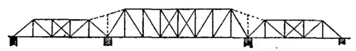 10. (e) Cantilever Bridges.—It has been stated that if in a girder bridge of three or more spans, the girders were made continuous there would be an important economy of material, but that the danger of settlement of the supports, which would seriously alter the points of contrary flexure or points where the bending moment changes sign, and therefore the magnitude and distribution of the stresses, generally prevents the adoption of continuity. If, however, hinges or joints are introduced at the points of contrary flexure, they become necessarily points where the bending moment is zero and ambiguity as to the stresses vanishes. The exceptional local conditions at the site of the Forth bridge led to the adoption there of the cantilever system, till then little considered. Now it is well understood that in many positions this system is the simplest and most economical method of bridging. It is available for spans greater than those practicable with independent girders; in fact, on this system the spans are virtually reduced to smaller spans so far as the stresses are concerned. There is another advantage which in many cases is of the highest importance. The cantilevers can be built out from the piers, member by member, without any temporary scaffolding below, so that navigation is not interrupted, the cost of scaffolding is saved, and the difficulty of building in deep water is obviated. The centre girder may be built on the cantilevers and rolled into place or lifted from the water-level. Fig. 21 shows a typical cantilever bridge of American design. In this case the shore ends of the cantilevers are anchored to the abutments. J. A. L. Waddell has shown that, in some cases, it is convenient to erect simple independent spans, by building them out as cantilevers and converting them into independent girders after erection. Fig. 22 shows girders erected in this way, the dotted lines being temporary members during erection, which are removed afterwards. The side spans are erected first on staging and anchored to the piers. From these, by the aid of the temporary members, the centre span is built out from both sides. The most important cantilever bridges so far erected or projected are as follows:—