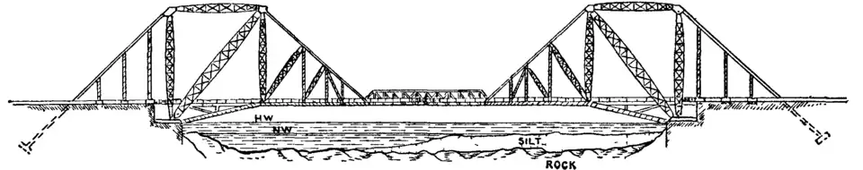 (7) The Jubilee bridge over the Hugli, designed by Sir Bradford Leslie, is a cantilever bridge of another type (fig. 26). The girders are of the Whipple Murphy type, but with curved top booms. The bridge carries a double line of railway, between the main girders. The central double cantilever is 360 ft. long. The two side span girders are 420 ft. long. The cantilever rests on two river piers 120 ft. apart, centre to centre. The side girders rest on the cantilevers on 15 in. pins, in pendulum links suspended from similar pins in saddles 9 ft. high.