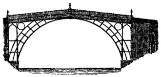 11. (f) Metal Arch Bridges.—The first iron bridge erected was constructed by John Wilkinson (1728–1808) and Abraham Darby (1750–1791) in 1773–1779 at Coalbrookdale over the Severn (fig. 27). It had five cast iron arched ribs with a centre span of 100 ft. This curious bridge is still in use. Sir B. Baker stated that it had required patching for ninety years, because the arch and the high side arches would not work together. Expansion and contraction broke the high arch and the connexions between the arches. When it broke they fished it. Then the bolts sheared or the ironwork broke in a new place. He advised that there was nothing unsafe; it was perfectly strong and the stress in vital parts moderate. All that needed to be done was to fish the fractured ribs of the high arches, put oval holes in the fishes, and not screw up the bolts too tight.