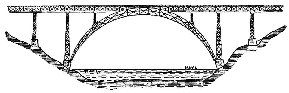 Of large-span bridges with steel arches, one of the most important is the St Louis bridge over the Mississippi, completed in 1874 (fig. 29). The river at St Louis is confined to a single channel, 1600 ft. wide, and in a freshet in 1870 the scour reached a depth of 51 ft. Captain J. B. Eads, the engineer, determined to establish the piers and abutments on rock at a depth for the east pier and east abutment of 136 ft. below high water. This was effected by caissons with air chambers and air locks, a feat unprecedented in the annals of engineering. The bridge has three spans, each formed of arches of cast steel. The centre span is 520 ft. and the side spans 502 ft. in the clear. The rise of the centre arch is 471/2 ft., and that of the side arches 46 ft. Each span has four steel double ribs of steel tubes butted and clasped by wrought iron couplings. The vertical bracing between the upper and lower members of each rib, which are 12 ft. apart, centre to centre, consolidates them into a single arch. The arches carry a double railway track and above this a roadway 54 ft. wide.