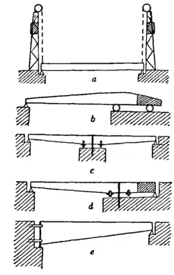 (4) Swing or Turning Bridges.—The largest movable bridges revolve about a vertical axis. The bridge is carried on a circular base plate with a central pivot and a circular track for a live ring and conical rollers. A circular revolving platform rests on the pivot and rollers. A toothed arc fixed to the revolving platform or to the live ring serves to give motion to the bridge. The main girders rest on the revolving platform, and the ends of the bridge are circular arcs fitting the fixed roadway. Three arrangements are found: (a) the axis of rotation is on a pier at the centre of the river and the bridge is equal armed (fig. 33 c), so that two navigation passages are opened simultaneously. (b) The axis of rotation is on one abutment, and the bridge is then usually unequal armed (fig. 33 d), the shorter arm being over the land. (c) In some small bridges the shorter arm is vertical and the bridge turns on a kind of vertical crane post at the abutment (fig. 33 e).