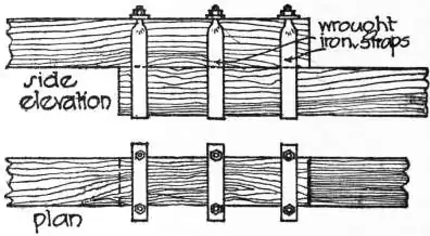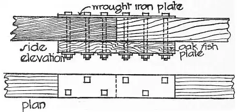 The fished joint (fig. 2) is used for lengthening beams and is constructed by butting the ends of two pieces of timber together with an iron plate on top and bottom, and bolting through the timber; these iron connecting-plates are usually about 3 ft. long and 1/4 in. and 1/2 in. in thickness. This joint provides a good and cheap method of accomplishing its purpose.