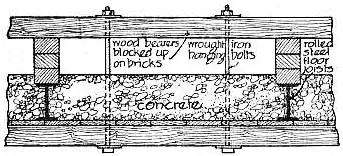 Centering.—Centering is temporary timber or framing erected so as to carry concrete floors or arches of brick or stone, &c.; when the work has set the centering is removed gradually. The centering for concrete floors is usually composed of scaffold boards resting on wood bearers (fig 20). One wood bearer rests along on top of the steel joists; through this bearer long bolts are suspended, and to the bottom of these bolts a second bearer is fixed, and on the bottom bearer the scaffold boards rest. Another method, not much used now, is to fit the boards to the size of the floor and prop them up on legs, but among other disadvantages this process takes up much space and is more costly.