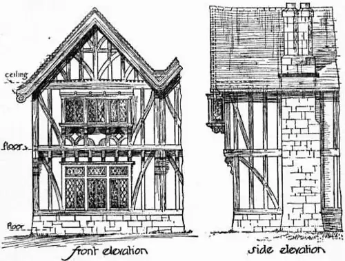 Timber Work.—Half timber work consists of a framework of timber; the upper storeys of suburban and country residences are often thus treated, and the spaces between the timbers are filled in with brickwork and plastered inside, and rough cast outside, though sometimes tiles are hung on the outside. In some instances in country places there is no filling between the timbers, and both sides are lath and plastered, and in others the timbers are solid, or facing pieces are simply plugged to the walls, the joints being pinned with hardwood pins. Half timber work (fig. 34) well designed has a very pleasing, homely and rural effect. The best and most durable wood to use is English oak worked smooth on the external face and usually painted; the by-laws of various authorities differ considerably as to the method of construction and in the restrictions as to its use. Some very fine early examples are to be seen in England, as at Holborn Bars, London, in the old parts of Bristol, and at Moreton Old Hall, near Congleton, Cheshire (see House, Plate IV. fig. 13).
