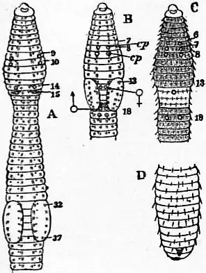 A, Lumbricus: 9, 10, segments containing spermathecae, the orifices of which are indicated; 14, segment bearing oviducal pores; 15, segment bearing male pores; 32, 37, first and last segments of clitellum. B, Acanthodrilus: cp, orifices of spermathecae; C, Perichaeta: the spermathecal pores are between segments 6 and 7, 7 and 8, 8 and 9, the oviducal pores upon the 14th and the male pores upon the 18th segment. |
