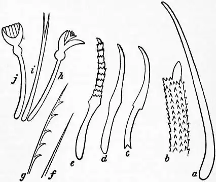 Setae.—The setae of the Polychaeta are disposed in two bundles in many genera, but in only one bundle in such forms as have no notopodium (e.g. Syllis). In some genera the setae are in vertical rows, and in certain Capitellidae these rows so nearly meet that an arrangement occurs reminiscent of the continuous circle of setae in the perichaetous Oligochaeta. The setae vary much in form and are often longer and stronger than in the Oligochaetes. Jointed setae and very short hooks or “uncini” (see fig. 3) are among the most remarkable forms. Simple bifid setae, such as those of Oligochaetes, are also present in certain forms.