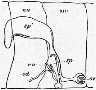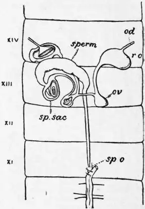 | Fig. 12.—Female reproductive system of Heliodrilus.—XI-XIV, eleventh to fourteenth segments, sperm, spermatheca; sp.o, its external orifice; sp.sac, spermathecal sac; ov, sac containing ovary; r.o, egg sac; od, oviduct. |