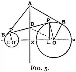 There are several methods of constructing the radical axis in this case. One of the simplest is: Let P and P′ (fig. 5) be the points of contact of a common tangent; drop perpendiculars PL, P′L′, from P and P′ to OO′, the line joining the centres, then the radical axis bisects LL′ (at X) and is perpendicular to OO′. To prove this let AB, AB¹ be the tangents from any point on the line AX. Then by Euc. i. 47, AB2=AO2–OB2=AX2+OX2+OP2; and OX2=OD2–DX2=OP2+PD2–DX2. Therefore AB2=AX2–DX2+PD2. Similarly AB′2=AX2–DX2+DP′2. Since PD=PD′, it follows that AB=AB′.