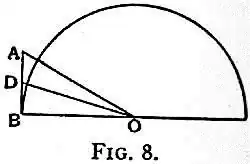 With Archimedes (287–212 B.C.) a notable advance was made. Taking the circumference as intermediate between the perimeters of the inscribed and the circumscribed regular 𝑛-gons, he showed that, the radius of the circle being given and the perimeter of some particular circumscribed regular polygon obtainable, the perimeter of the circumscribed regular polygon of double the number of sides could be calculated; that the like was true of the inscribed polygons; and that consequently a means was thus afforded of approximating to the circumference of the circle. As a matter of fact, he started with a semi-side AB of a circumscribed regular hexagon meeting the circle in B (see fig. 8), joined A and B with O the centre, bisected the angle AOB by OD, so that BD became the semi-side of a circumscribed regular 12-gon; then as AB:BO:OA::1: √3:2 he sought an approximation to √3 and found that AB:BO > 153:265. Next he applied his theorem[4] BO + OA:AB::OB:BD to calculate BD; from this in turn he calculated the semi-sides of the circumscribed regular 24-gon, 48-gon and 96-gon, and so finally established for the circumscribed regular 96-gon that perimeter:diameter < 31/7:1. In a quite analogous manner he proved for the inscribed regular 96-gon that perimeter:diameter > 310/71:1. The conclusion from these therefore was that the ratio of circumference to diameter is < 31/7 and > 310/71. This is a most notable piece of work; the immature condition of arithmetic at the time was the only real obstacle preventing the evaluation of the ratio to any degree of accuracy whatever.[5]