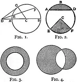 The form of a circle is familiar to all; and we proceed to define certain lines, points, &c., which constantly occur in studying its geometry. The fixed point in the preceding definition is termed the “centre” (C in fig. 1); the constant distance, e.g. CG, the “radius.” The curve itself is sometimes termed the “circumference.” Any line through the centre and terminated at both extremities by the curve, e.g. AB, is a “diameter”; any other line similarly terminated, e.g. EF, a “chord.” Any line drawn from an external point to cut the circle in two points, e.g. DEF, is termed a “secant”; if it touches the circle, e.g. DG, it is a “tangent.” Any portion of the circumference terminated by two points, e.g. AD (fig. 2), is termed an “arc”; and the plane figure enclosed by a chord and arc, e.g. ABD, is termed a “segment”; if the chord be a diameter, the segment is termed a “semicircle.” The figure included by two radii and an arc is a “sector,” e.g. ECF (fig. 2). “Concentric circles” are, as the name obviously shows, circles having the same centre; the figure enclosed by the circumferences of two concentric circles is an “annulus” (fig. 3), and of two non-concentric circles a “lune,” the shaded portions in fig. 4; the clear figure is sometimes termed a “lens.”