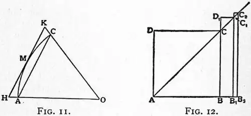 equal to 𝑟, he produced it only so far that, when the extremity D′ was joined with C, the part D′F outside the circle was equal to 𝑟; in other words, by a non-Euclidean construction he trisected the angle AOC, for it is readily seen that, since FD′ = FO = OC, the angle FOB = 1/3AOC.[14] This couplet of constructions is as important from the calculator’s point of view as it is interesting geometrically. To compare it on this score with the fundamental proposition of Archimedes, the latter must be put into a form similar to Snell’s. AMC being an arc of a circle (see fig. 11) whose centre is O, AC its chord, and HK the tangent drawn at the middle point of the arc and bounded by OA, OC produced, then, according to Archimedes, AMC < HK, but > AC. In modern trigonometrical notation the propositions to be compared stand as follows:—