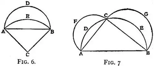 [The Greeks were in possession of several relations pertaining to the quadrature of the lune. The following are among the more interesting. In fig. 6, ABC is an isosceles triangle right angled at C, ADB is the semicircle described on AB as diameter, AEB the circular arc described with centre C and radius CA=CB. It is easily shown that the areas of the lune ADBEA and the triangle ABC are equal. In fig. 7, ABC is any triangle right angled at C, semicircles are described on the three sides, thus forming two lunes AFCDA and CGBEC. The sum of the areas of these lunes equals the area of the triangle ABC.]