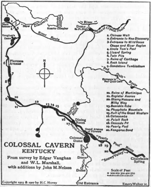 Tremendous forces have been at work, suggesting earthquakes and eruptions; but really all is due to the chemical and mechanical action of water. The so-called “Ruins of Carthage” fill a hall 400 ft. long by 100 ft. wide and 30 ft. high, whose flat roof is a vast homogeneous limestone block. Isolated detached blocks measure from 50 to 100 ft. in length. Edgar Vaughan and W. L. Marshall, civil engineers, surveyed every part of the cave. Vaughan’s Dome is 40 ft. wide, 300 ft. long, and 79 ft. high. Numerous other domes exist, and many deep pits. The grandest place of all is the Colossal Dome, which used to be entered only from the apex by windlass and a rope reaching 135 ft. to the floor. This is now used only for illumination by raising and lowering a fire-basket. The present entrance is by a gateway buttressed by alabaster shafts, one of which, 75 ft. high, is named Henry Clay’s Monument. The dome walls arise in a series of richly tinted rings, each 8 or 10 ft. thick, and each fringed by stalactites. The symmetry is remarkable, and the reverberations are strangely musical. The Pearly Pool, in a chamber near a pit 86 ft. deep, glistens with countless cave pearls. The route beyond is between rows of stately shafts, and ends in a copious chalybeate spring. Blind flies, spiders, beetles and crickets abound; and now and then a blind crawfish darts through the waters; but as compared with many caverns the fauna and flora are not abundant. It is conjectured, not without some reason, that there is a connexion, as yet undiscovered, between the Colossal and the Mammoth caves. It seems certain that Eden Valley, which now lies between them, is a vast “tumble-down” of an immense cavern that formerly united them into one. (H. C. H.)