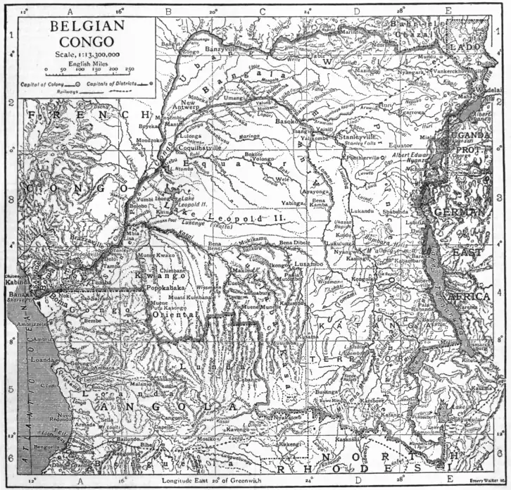 - ↑ The best known of these companies are the Abir (Anglo-Belgian India-rubber and Exploration Co.) and the Société anversoise du commerce au Congo. In Katanga the companies holding concessions and the state are jointly represented by the Comité spécial du Katanga. In 1906 four new companies were formed in which British, American and French capital was largely invested. Of these companies the Union minière du Haut Katanga had for object the development of the mineral wealth of the district named, while the Chemin de fer du Bas Congo undertook to build a railway from Leopoldville to Katanga. The American Congo Company was granted a rubber concession in the Kasai basin. The fourth company, the Société internationale forestière et minière du Congo, combined mining operations with the exploitation of forest produce.