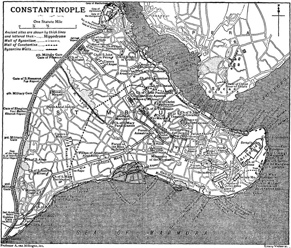 The most noteworthy points in the circuit of the walls of the city are the following. (1) The Golden gate, now included in the Turkish fortress of Yedi Kuléh. It is a triumphal archway, consisting of three arches, erected in honour of the victory of Theodosius I. over Maximus in 388, and subsequently incorporated in the walls of Theodosius II., as the state entrance of the capital. (2) The gate of Selivria, or of the Pegé, through which Alexius Strategopoulos made his way into the city in 1261, and brought the Latin empire of Constantinople to an end. (3) The gate of St Romanus (Top Kapusi), by which, in 1453, Sultan Mahommed entered Constantinople after the fall of the city into Turkish hands. (4) The great breach made in the ramparts crossing the valley of the Lycus, the scene of the severest fighting in the siege of 1453, where the Turks stormed the city, and the last Byzantine emperor met his heroic death. (5) The palace of the Porphyrogenitus, long erroneously identified with the palace of the Hebdomon, which really stood at Makrikeui. It is the finest specimen of Byzantine civil architecture left in the city. (6) The tower of Isaac Angelus and the tower of Anemas, with the chambers in the body of the wall to the north of them. (7) The wall of Leo, against which the troops of the Fourth Crusade came, in 1203, from their camp on the hill opposite the wall, and delivered their chief attack. (8) The walls protecting the quarter of Phanar, which the army and fleet of the Fourth Crusade under the Venetian doge Henrico Dandolo carried in 1204. (9) Yali Kiosk Kapusi, beside which the southern end of the chain drawn across the mouth of the harbour during a siege was attached. (10) The ruins of the palace of Hormisdas, near Chatladi Kapu, once the residence of Justinian the Great and Theodora. It was known in later times as the palace of the Bucoleon, and was the scene of the assassination of Nicephorus Phocas. (11) The sites of the old harbours between Chatladi Kapu and Daud Pasha Kapusi. (12) The fine marble tower near the junction of the walls along the Marmora with the landward walls.