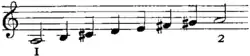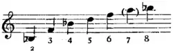 ![]() | Harmonic series of the B♭ cornet—the 7th is slightly flat, a defect which the performer corrects, if he uses the note at all. |