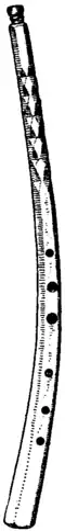 (a) Cornet or Cornett (Fr. cornet, cornet à bouquin; Ger. Zinck, Zincken; Ital. cornetto) is the name given to a family of wood wind instruments, now obsolete, having a cup-shaped mouthpiece and a conical bore without a bell, and differing entirely from the modern cornet à pistons. The old cornets were of two kinds, the straight and the curved, characterized by radical differences in construction. There were two very different kinds of straight cornets (Ger. gerader Zinck, Ital. cornetto diretto or recto), the one most commonly used having a detachable cup-shaped mouthpiece similar to that of the trumpet, while the other was made to all appearance without mouthpiece, there being not even a moulded rim at the end of the tube to break the rigid straight line. Examination of the tube, however, reveals the secret of the characteristic sweet tone of this latter kind of cornet; unsuspected inside the top of the tube is cut out of the thickness of the wood a mouthpiece, not cup-shaped, but like a funnel similar to that of the French horn, which merges gradually into the bore of the instrument. This mode of construction, together with the narrower bore adopted, greatly influenced the timbre of the instrument, whose softer tone was thus due mainly to the substitution of the funnel for the sharp angle of incidence at the bottom of the cup mouthpiece known as the throat (see Mouthpiece), where it communicates with the tube. It is this sharp angle, which in the other cornets with detachable mouthpiece, causes the column of air to break, producing a shrill quality of tone, while the wider bore and slightly rough walls of the tube account for the harshness. In Germany the sweet-toned cornet was known as stiller or sanfter Zinck, and in Italy as cornetto muto (fig. 1), while in France the instruments with detachable mouthpiece were distinguished by the addition of à bouquin (= with mouthpiece). The curved cornet (Ger. krummer Zinck or Stadtkalb; Ital. cornetto curvo) could not for obvious reasons have the bore pierced through a single piece of wood; the channel for the vibrating column of air was, therefore, hollowed out of two pieces of wood, the diameter increasing from the mouthpiece to the lower end. The two pieces of wood thus prepared were joined together with glue and covered with leather, the outer surface of the tube being finished off in octagonal shape. The separate mouthpiece, made indifferently of wood, horn, ivory or metal,[1] analogous to that of the trumpet, was distinctly cup-shaped and fixed by a tenon to the upper extremity of the pipe. The primitive instrument was an animal’s horn.