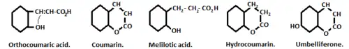 Umbelliferone or 4-oxycoumarin, occurs in the bark of Daphne mezereum and may be obtained by distilling such resins as galbanum or asafoetida. It may be synthesized from resorcin and malic anhydride or from β resorcyl aldehyde, acetic anhydride and sodium acetate. Daphnetin and Aesculetin are dioxycoumarins.