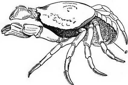 Among the Anomura, the best known are the hermit-crabs, which live in the empty shells of Gasteropod Mollusca, which they carry about with them as portable dwellings. In these, the abdomen is soft-skinned and spirally twisted so as to fit into the shells which they inhabit. The common hermit-crab of the British coasts (Pagurus or Eupagurus Bernhardus) is sometimes called the soldier-crab from its pugnacity. Small specimens are found between tide-marks inhabiting the shells of periwinkles and other small molluscs, but the full-grown specimens live in deeper water and are usually found in the shell of the whelk (Buccinum). As the crab grows it changes its dwelling from time to time, often having to fight with its fellows for the possession of an empty shell. Sometimes an annelid worm lives inside the shell along with the hermit and often the outside is covered with zoophytes. In some species, as in the British Eupagurus prideauxi, a sea-anemone is constantly found attached to the shell, profiting by the active locomotion of the crab and probably sharing the crumbs of its food, while it affords its host protection by its stinging powers.