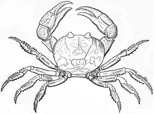 The Brachyura, or true crabs, are distinguished from the long-tailed lobsters and shrimps which form the order Macrura, by the fact that the abdomen or tail is of small size and is carried folded up under the body. In most of them the body is transversely oval or triangular in outline and more or less flattened, and is covered by a hard shell, the carapace. There are five pairs of legs. The first pair end in nippers or chelae and are usually much more massive than the others which are used in walking or swimming. The eyes are set on movable stalks and can be withdrawn into sockets in the front part of the carapace. There are six pairs of jaws and foot-jaws (maxillipeds) enclosed within a “buccal cavern,” the opening of which is covered by the broad and flattened third pair of foot-jaws. The abdomen is usually narrow and triangular in the males, but in the females it is broad and rounded and bears appendages to which the eggs are attached after spawning (fig. 1).