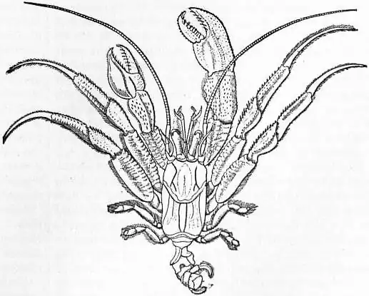 As in most Crustacea, the young of nearly all crabs, when newly hatched, are very different from their parents. The first larval stage is known as a Zoëa, this name having been given to it when it was believed by naturalists to be a distinct and independent species of animal. The Zoëa is a minute transparent organism, swimming at the surface of the sea. It has a rounded body, armed with long spines, and a long segmented tail. The eyes are large but not set on stalks, the legs are not yet developed, and the foot-jaws form swimming paddles. After casting its skin several times as it grows in size, the young crab passes into a stage known as the Megalopa (fig. 2), also formerly regarded as an independent animal, in which the body and limbs are more crab-like, but the abdomen is large and not filled up. After a further moult the animal assumes a form very similar to that of the adult. There are a few crabs, living on land or in fresh water, which do not pass through a metamorphosis but leave the egg as miniature adults.