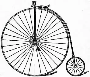For the next 20 years little was done, and then began the evolution of the high “ordinary” bicycle with a large driving wheel in front and a small trailing one behind. About 1865 Pierre Lallement in Paris constructed a bicycle in which the front wheel was driven by pedals and cranks attached directly to its axle, but it is doubtful whether the origin of this idea must be attributed to him or to Ernest Michaux, the son of his employer, who was a carriage repairer. Lallement took his machine to the United States, and in 1866 was granted a patent which had an important influence on the subsequent course of the cycle industry in that country. This machine, consisting of a wooden frame supported on two wooden wheels (fig. 3), soon became popular in England, as well as in France and America, and came to be called bicycle (or bysicle) by those who took it seriously and “boneshaker” by those who did not. Improvements quickly followed, chiefly in England, for in America the popularity of the machine was short-lived, and in France the industry was checked by the Franco-German war. Rubber tires, in place of iron ones, appeared in 1868, and in two or three years were made very large, 2 in. or more in width. Suspension wheels, with wire spokes in tension, were seen at the Crystal Palace, London, on the “Phantom” (fig. 4) of W. F. Reynolds and J. A. Mays in 1869, and early in the same year the manufacture of bicycles, at first for export to France, was begun in England by the Coventry Sewing Machine Company, till then makers of sewing machines. There was a rapid growth in the size of the front wheel, which in the boneshaker normally measured 36 or 38 in. in diameter, with a corresponding shrinkage in the rear wheel (fig. 5), until by 1874, the date of the invention of the tangent wheel by J. K. Starley 54-in. wheels were being made. The high bicycle was now fairly established in form, and the changes made in the subsequent 10 or 15 years during which it retained its supremacy were chiefly in the details of construction, such as the adoption of steel tubing for the frames, the use of hollow rims in the wheels and the application first of cone and then of ball bearings to points of friction. The weight of a 54-in. bicycle, which in 1874–1875 exceeded 50 or even 60 ℔, was thus reduced to well under 40 ℔ in machines intended for use on ordinary roads, and to not much over 20 ℔ in the case of racers.