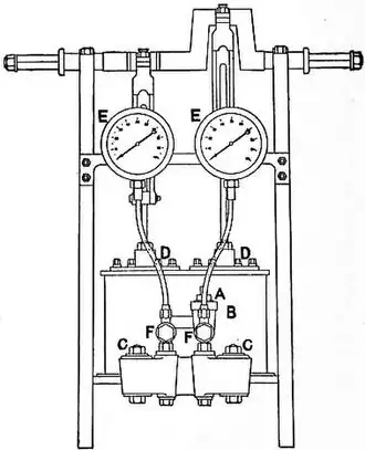 Air Pumps.—The type of air pump varies with the depth of water to which the diver has to descend; it will be readily understood that the greater the depth the greater the quantity of air required by the diver. The pattern most generally in favour amongst divers of all classes is a three-cylinder single-acting pump, which is suitable for almost every description of work which the diver may be called upon to perform, either in deep or shallow water. Another most useful type is a two-cylinder double-acting pump (figs. 1 and 2), which is designed to supply two divers working simultaneously in moderate depths of water, or one diver only in deep water. An air-distributing arrangement is fitted, whereby, when it is desired to send two men down together, each cylinder supplies air independently of the other; and when it is required to send one diver into deep water, the two cylinders are connected and the full volume of air from both is delivered to the one man. The same duty is also performed by a four-cylinder single-acting pump. Smaller pumps, having one double-acting or two single-acting cylinders, are also used for shallow water work.