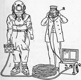 | Fig. 4.—Diver’s Telephone Communication with the Surface. Q, Battery, with switch and bell in case. R, Attendant’s receiver and transmitter. |