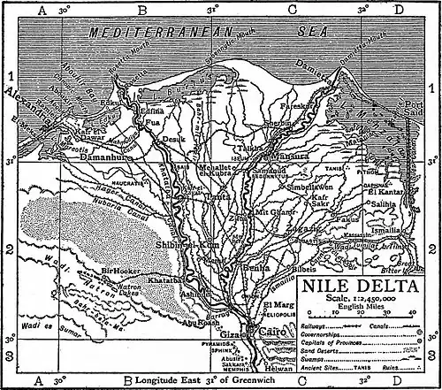 Boundaries and Areas.—Egypt is bounded N. by the Mediterranean, S. by the Anglo-Egyptian Sudan, N.E. by Palestine, E. by the Red Sea, W. by Tripoli and the Sahara. The western frontier is ill-defined. The boundary line between Tripoli and Egypt is usually taken to start from a point in the Gulf of Sollum and to run S. by E. so as to leave the oasis of Siwa to Egypt. South of Siwa the frontier, according to the Turkish firman of 1841, bends eastward, approaching the cultivated Nile-land near Wadi Halfa, i.e. the southern frontier. This southern frontier is fixed by agreement between Great Britain and Egypt at the 22° N. The N.E. frontier is an almost direct line drawn from Taba, near the head of the Gulf of Akaba, the eastern of the two gulfs into which the Red Sea divides, to the Mediterranean at Rafa in 34° 15′ E. The peninsula of Sinai, geographically part of Asia, is thus included in the Egyptian dominions. The total area of the country is about 400,000 sq. m., or more than three times the size of the British Isles. Of this area 14/15ths is desert. Canals, roads, date plantations, &c., cover 1900 sq. m.; 2850 sq. m. are comprised in the surface of the Nile, marshes, lakes, &c. A line corresponding with the 30° N., drawn just S. of Cairo, divides the country into Lower and Upper Egypt, natural designations in common use, Lower Egypt being the Delta and Upper Egypt the Nile valley. By the Arabs Lower Egypt is called Er-Rif, the cultivated or fertile; Upper Egypt Es Saʽid, the happy or fortunate. Another division of the country is into Lower, Middle and Upper Egypt, Middle Egypt in this classification being the district between Cairo and Assiut.