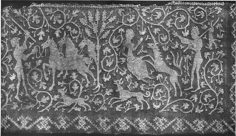 Tristan, agreeing in the main part with the novella entitled “La Tavola Rotonda o l’istoria di Tristano.” The quilt dates from the end of the 14th century. Many pattern-books for embroidery and lace were published in Italy in the 16th and 17th centuries.[10]