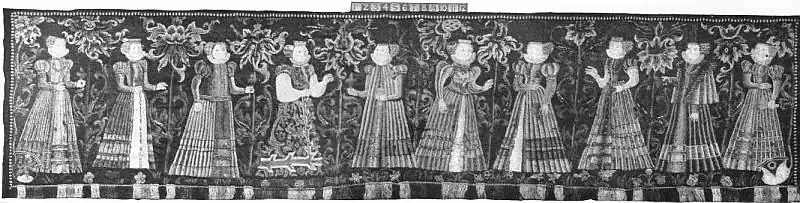 | Fig. 8.—HANGING OF WOOLLEN CLOTH, EMBROIDERED WITH THE FIVE WISE AND THE FIVE FOOLISH VIRGINS. German work, dated 1598. Scale: 1/10th. |