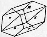 EPIDOTE, a mineral species consisting of basic calcium, aluminium and iron orthosilicate, Ca2(AlOH)(Al, Fe)2(SiO4)3, crystallizing in the monoclinic system. Well-developed crystals are of frequent occurrence: they are commonly prismatic in habit, the direction of elongation being perpendicular to the single plane of symmetry. The faces lettered M, T and r in the figure are often deeply striated in the same direction: M is a direction of perfect cleavage, and T of imperfect cleavage: crystals are often twinned on the face T. Many of the characters of the mineral vary with the amount of iron present (Fe2O3, 5-17%), for instance, the colour, the optical constants, and the specific gravity (3.3-3.5). The hardness is 6½. The colour is green, grey, brown or nearly black, but usually a characteristic shade of yellowish-green or pistachio-green. The pleochroism is strong, the pleochroic colours being usually green, yellow and brown. The names thallite (from θαλλός, “a young shoot”) and pistacite (from πιστάκια, “pistachio nut”) have reference to the colour. The name epidote is one of R. J. Haüy’s crystallographic names, and is derived from ἐπίδοσις, “increase,” because the base of the primitive prism has one side longer than the other. Several other names (achmatite, bucklandite, escherite, puschkinite, &c.) have been applied to this species. Withamite is a carmine-red to straw-yellow, strongly pleochroic variety from Glencoe in Scotland. Fouqueite and clinozoisite are white or pale rose-red varieties containing very little iron, thus having the same chemical composition as the orthorhombic mineral zoisite (q.v.).