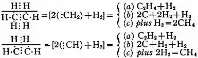 “In the ease of acetylene, the main primary change may be either one of polymerization or of dissolution according to the temperature, and if the latter, it may be supposed that the molecule breaks down across the triple bond between the carbon atoms, giving rise to 2(∶ CH), and that these residues are subsequently either resolved into carbon and hydrogen or “hydrogenized” according to circumstances, thus:—