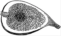 | Fig. 6.—Peduncle of Fig (Ficus Carica), ending in a hollow receptacle, enclosing numerous male and female flowers. |