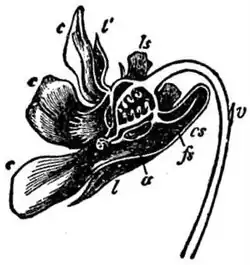 Fig. 75.—The stamen of the Barberry (Berberis vulgaris), showing one of the valves of the anther (v) curved upwards, bearing the pollen on its inner surface. | ||||||